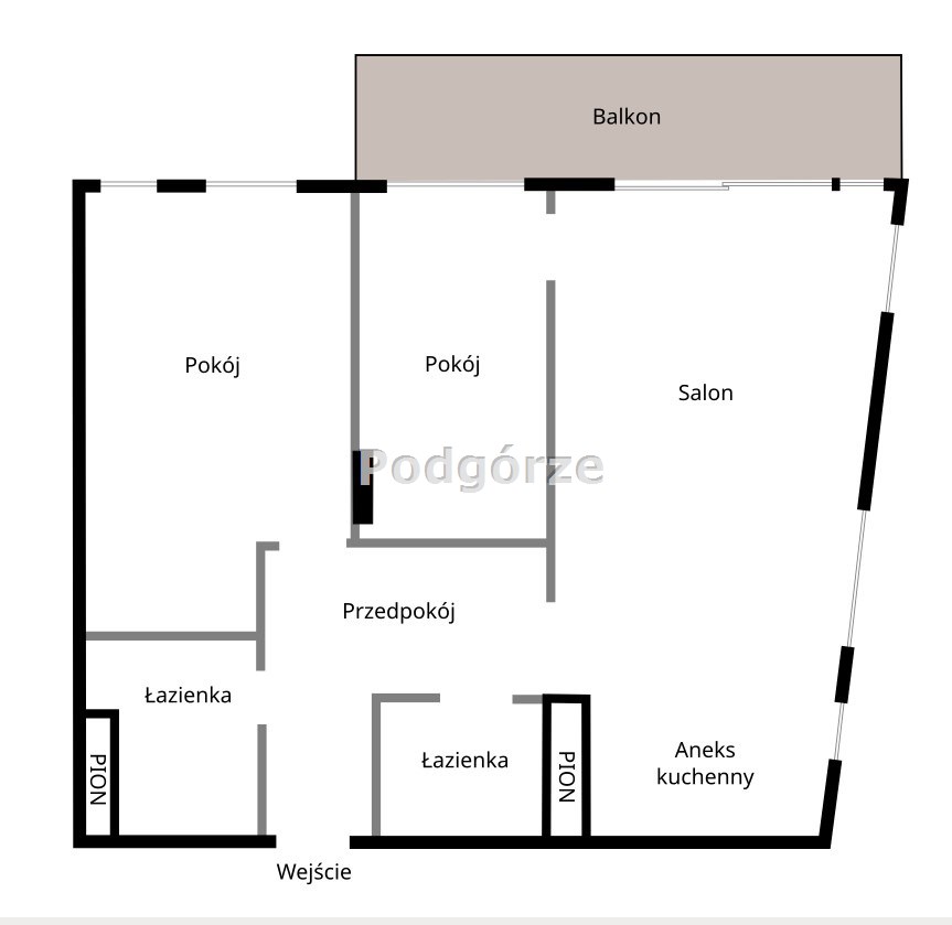 Obecny układ to salon o powierzchni 29 mkw połączony z kuchnią, dwie sypialnie, dwie łazienki, przedpokój oraz balkon o powierzchni 11,7 mkw.