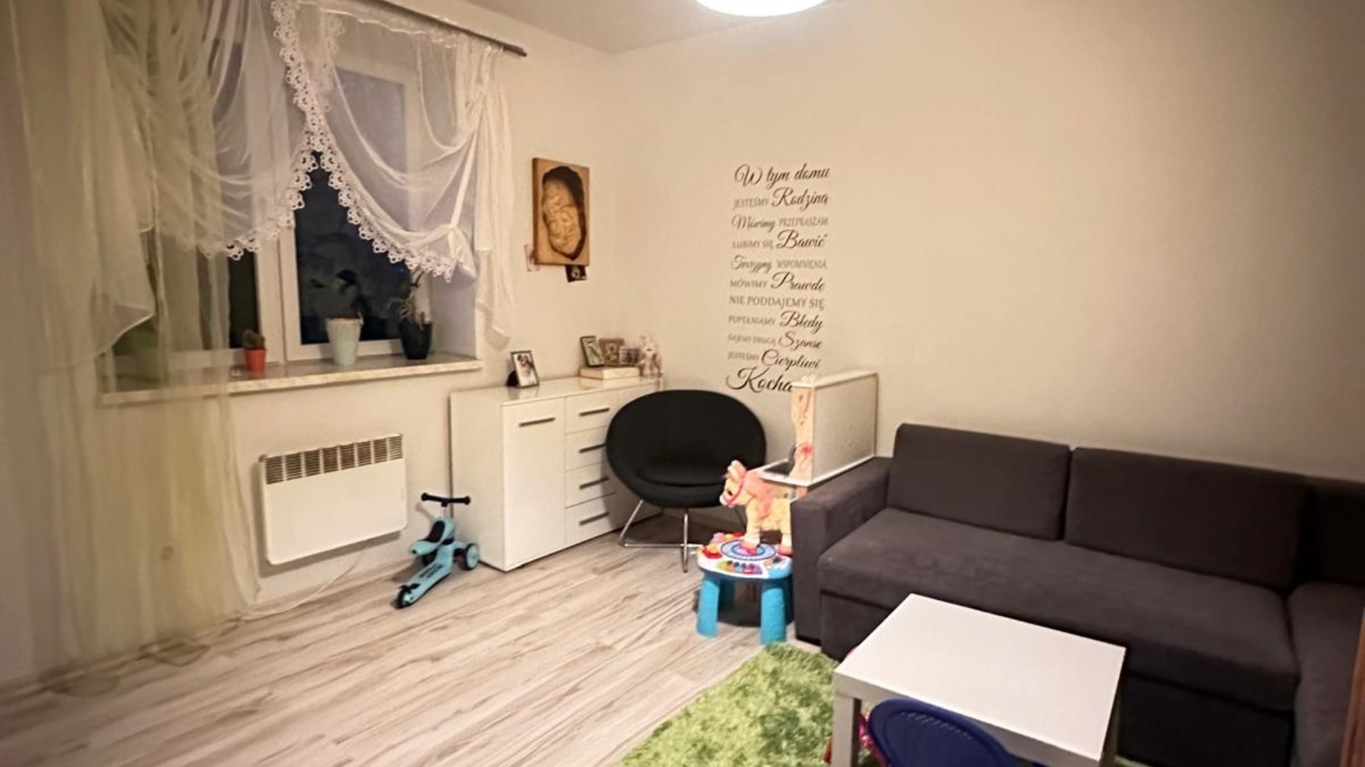 Obecny układ to: przedpokój, osobna i jasna kuchnia, pokój, łazienka z toaletą.