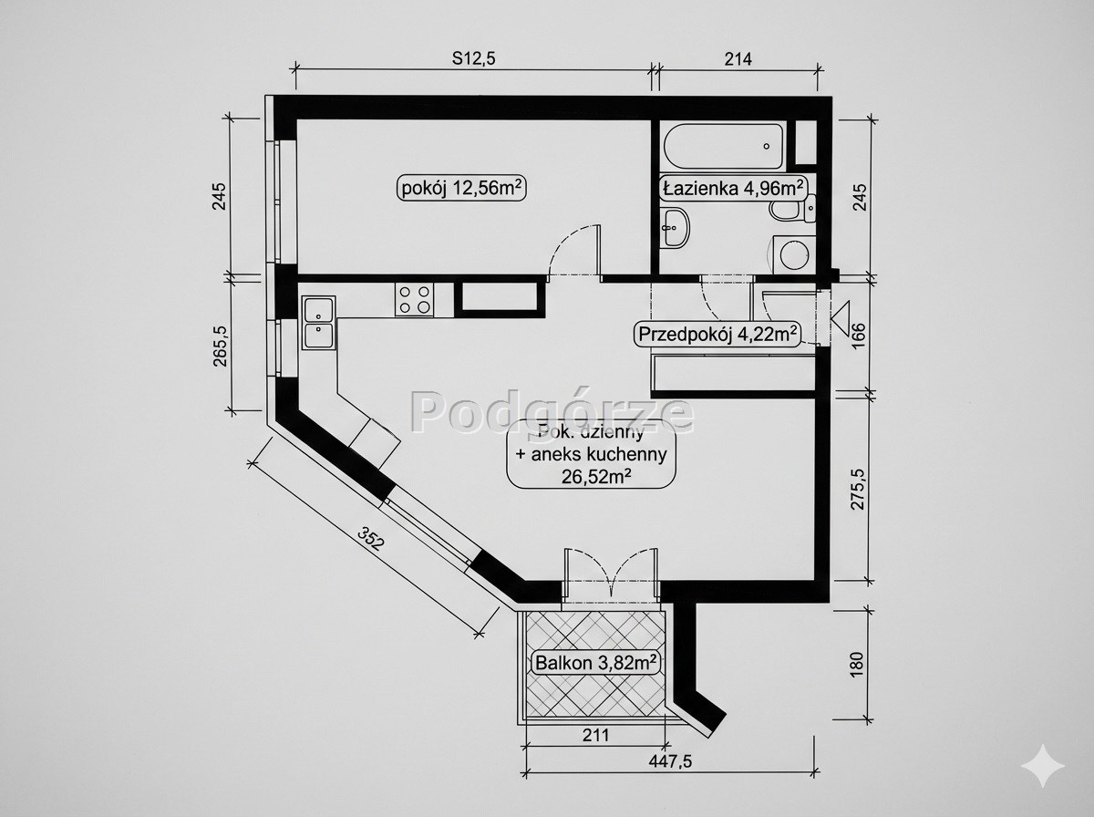 - salon z kuchnią otwartą (można zamknąć), sypialnia, łazienka z toaletą, przedpokój